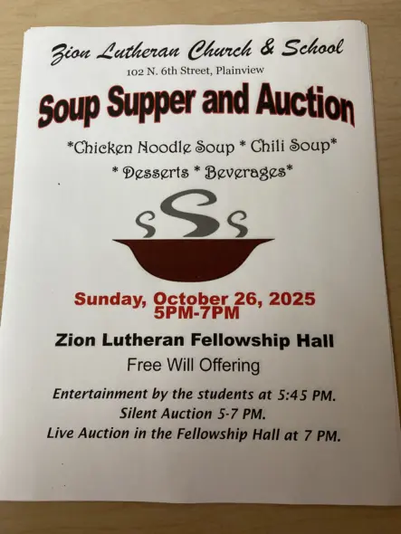Zion Lutheran Church & School Annual Soup Supper & Auction is October 26 5-7pm. Serving Chicken Noodle & Chili Soups. Free will offering. Entertainment by students at 5:45pm Silent Auction 5-7pm Live Auction in the Fellowship Hall at 7pm