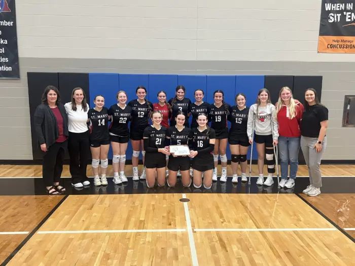 Niobrara – EPPJ defeated St. Mary’s in 4 sets: 25-23, 25-23, 21-25, 25-12, bringing home the NVC Championship Trophy! It was a back and forth match throughout the first three sets, both teams going on multiple runs, and the Lady Wolfpack were able to pull away in the 4th set in a dominant 20-2 run! Congratulations to both teams for excellent showings!