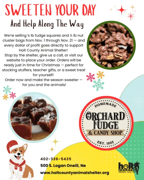The Holt County Animal Shelter is selling handmade Fudge and Clusters from the Orchard Fudge & Candy Shop. You can order online at our website www.holtcountyanimalshelter.org, or place an order in person between 2pm & 5pm at the shelter, now until Nov. 21st. These sweet treats will be available just in time for Christmas gift giving! We would like to thank our community for their amazing support!