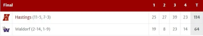 Hastings shot 42 percent from the field and was 7-21 from three-point land in the first half, compared to 46 percent overall by Waldorf, who were held without a three in the period. Hastings scored 26 points off of 26 turnovers in the opening half with 21 steals. Kissinger had 16 points and Mlnarik had 11 points to lead the way.