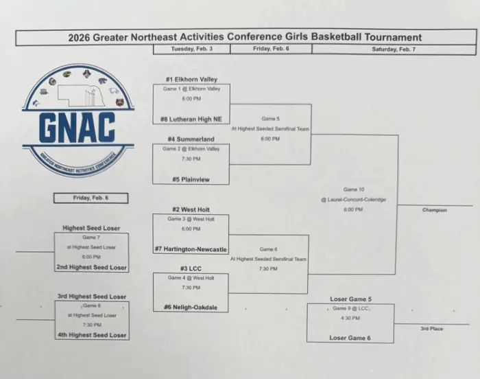 Lutheran High NE will be the 1 seed in the Boy’s Tournament and Plainview is the 2nd seed, both schools will host the opening round on Monday, February 2nd with games at 6 & 7:30pm at either location.