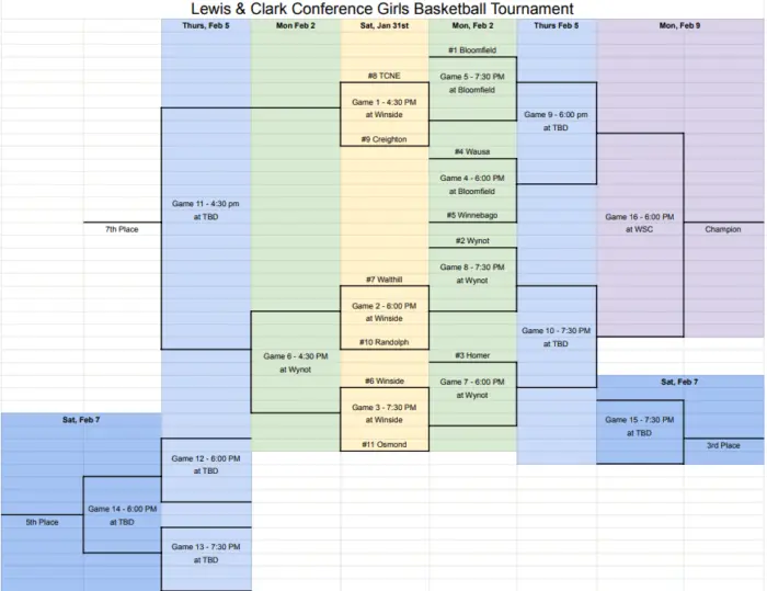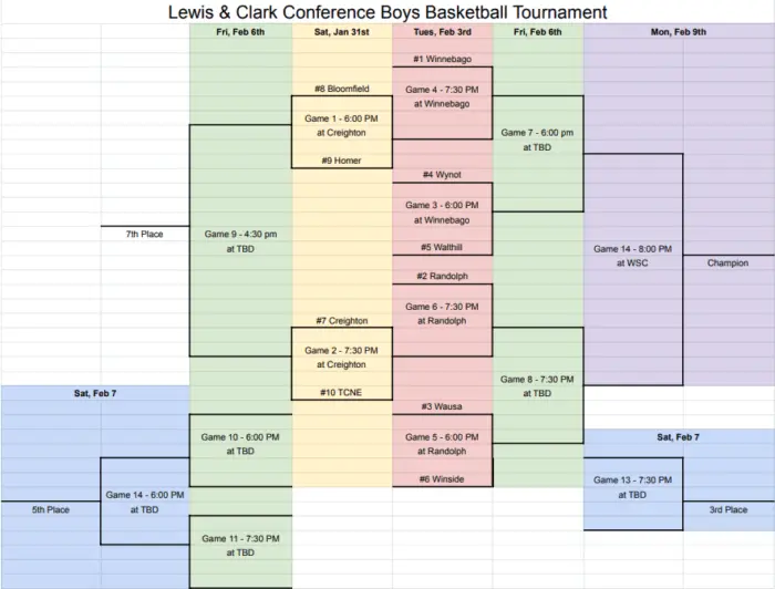 The Lewis & Clark Conference Basketball Tournaments will start this coming Saturday, January 31st and will run through Monday, February 9th! The tourneys will start with play-in games this Saturday, January 31st from Creighton and Winside. Good luck to our area teams competing in the Lewis & Clark Conference Tournaments!
