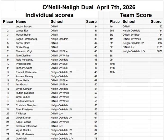 O’Neill vs Neligh-Oakdale Dual Results 4-7-26