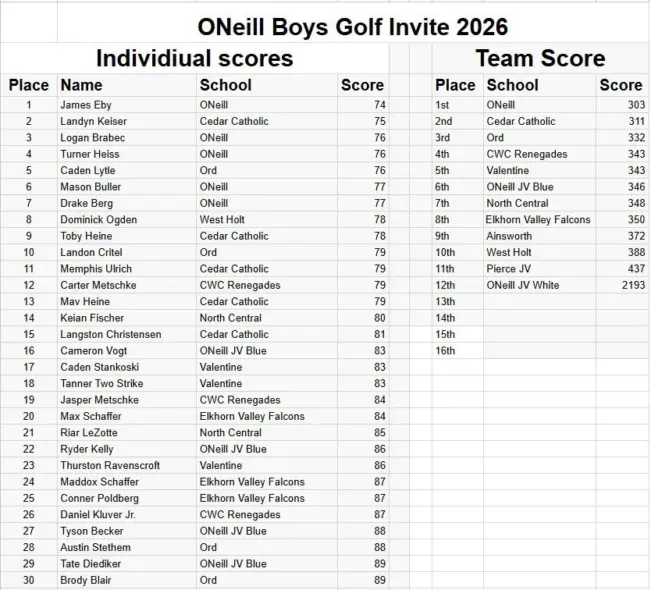O’Neill – It was nearly a perfect day for golf during the O’Neill Golf Invite, which led to some amazing scores! Teams competing included Ainsworth, Cedar Catholic, CWC, Elkhorn Valley, North Central, O’Neill, Ord, Valentine, & West Holt!