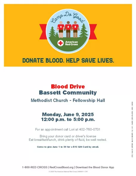 There will be a Red Cross Blood Drive on Monday, June 9, from Noon to 5 pm at the Bassett Methodist Church. Catch these rewards: Give blood in June for a $15 Amazon.com Gift Card by email + chance at a $7K prize! Book now by using the Red Cross Blood app or by calling Lori at 402-760-0731.