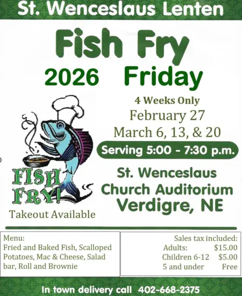 The St. Wenceslaus Church in Verdigre invites you to their Lenten Fish Fry on Friday, March 6 with serving from 5 pm to 7:30 pm. Enjoy Fried & Baked Fish, Scalloped Potatoes, Mac & Cheese, Salad Bar, Roll & Brownie. Cost is $15 Adults, $5 for children 6- 12, and 5 & under are Free. Takeout is available. For in town delivery, call 402-668-2375.