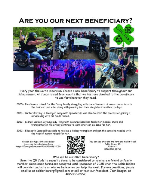 Josh & Teal Reagan with the Celtic Riders Riding Group are seeking a beneficiary that could use some financial assistance. Click the QR Code below or call if you need assistance or know of someone that could use some assistance. They are also have their Christmas Bowling Party on December 13 at O'Neill Lanes and invite everyone out.