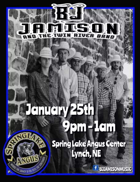 Saturday, January 25th – BJ Jamison will be playing live at the Springlake Angus Center, kitchen and cash bar open at 6, BJ takes the stage at 9:00!