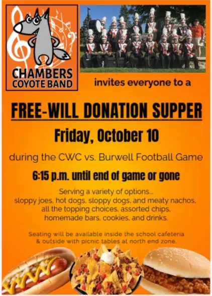 On Friday October 10th –everyone is invited to attend the Marching Home Show at 5:45 PM at the school flag pole.  Come and be introduced to band members and hear their great tunes.  After the performance–stay for the free will donation supper during the CEC VS Burwell game.  The supper starts at 6:15 and meal options include:  sloppy joes, hot dogs, sloppy dogs, and meaty nachos., bars, chips, and a drink.
