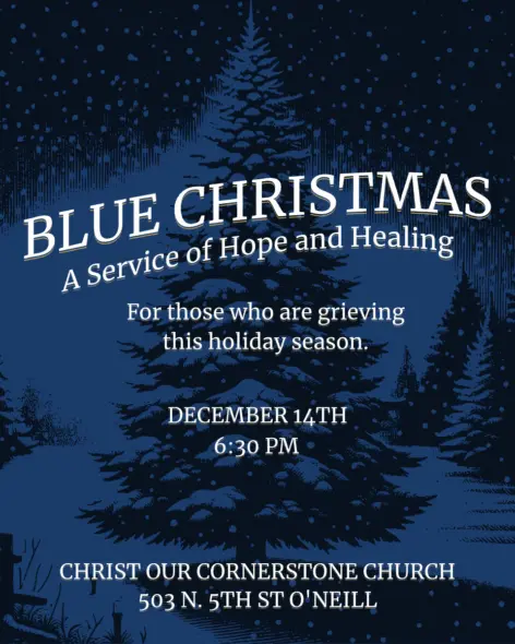 Christ Our Cornerstone Church at 503 North 5th Street in O’Neill will have a Blue Christmas Service of Hope and Healing on Sunday, December 14, at 6:30 pm. This service is for anyone who is grieving this holiday season.