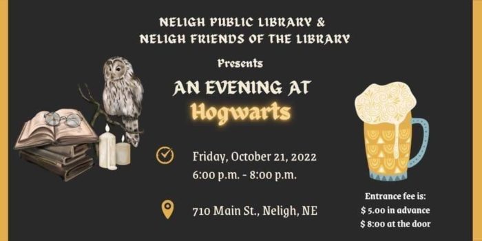 The Neligh Public Library & Neligh Friends of the Library present “An Evening at Hogwarts!” on Friday, October 21 from 6 pm to 8 pm at the Library.  There will be many fun events.  Come in authentic dress if you dare and don’t forget your broom, your invitation and your cash.  Entrance to the event is $5 in advance and $8 at the door.  Pre-registration is required and an invitation is only available at the Neligh Public Library at 710 Main Street in Neligh. Or you can call 402-887-5140.