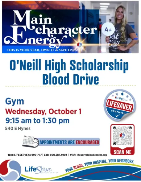 There will be a lifeserve ” O’Neill High School Scholarship” Blood Drive inside the high school gym Wednesday October October 1st from 9:15am to 1:30pm. Appointments are encourage, walk ins are always welcome. Schedule your appointment today by texting. LIFESERVE to 999-777 or call 800-287 4903