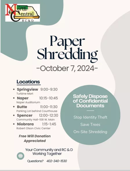 Do you have financial papers, medical records, or other sensitive documents you don’t know what to do with? The North Central RC&D has partnered with communities along Highway 20 and Highway 12 to offer on-site paper shredding. On October 7th, the truck will make stops in Springview, Naper, Butte, Spencer, and Niobrara. Documents can be in files with paper clips, however, larger metal clips need to be removed. There is no charge for individuals and businesses to bring paper, however, free will donations are appreciated to cover the cost of the event. If you have any questions or anticipate bringing a high volume of documents, please call Carla at 402-340-1530.\