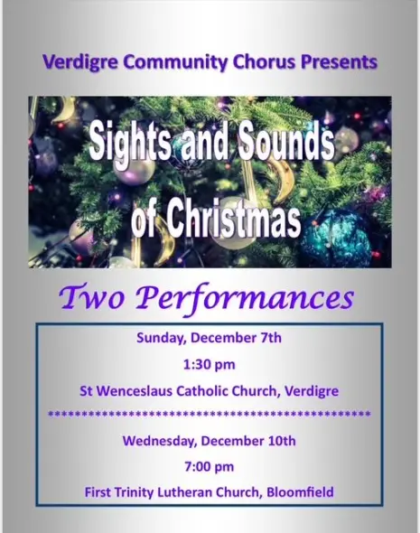 The Verdigre Community Chorus would like to invite you to their Christmas concert, entitled “Sights and Sounds of Christmas”. The second performance will be held on Wednesday, December 10th at First Trinity Lutheran Church in Bloomfield at 7:00 PM.  A free will offering will be taken at intermission. Refreshments will be served after each performance. The chorus, under the direction of Laurel Johnson, and accompanied by Nancy Pavelka, has thirty-six members for this year’s concert.  Besides Verdigre, members travel from Creighton, Bloomfield, Plainview, Wausa, Page, and Niobrara.  Come and enjoy the beautiful music that will remind you of the reason for this Christmas season.
