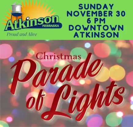 The Atkinson Parade of Lights will be on Sunday, November 30, in downtown Atkinson. Enjoy Hot Cocoa, Cider & Cookies from 4 pm to 6 pm at the Atkinson Senior Center for a free-will donation, the St. Joseph Alter Society will have soup supper at the KC Hall from 4:30 pm til gone, and then the Parade of Lights is at 6 pm.