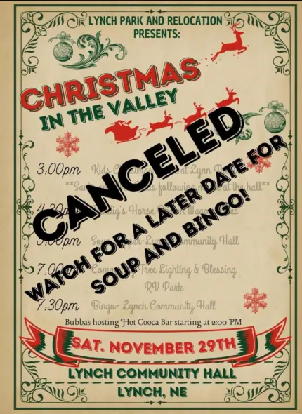 Due to the weather the Christmas in the Valley event in Lynch for Saturday, November 29th has been canceled.