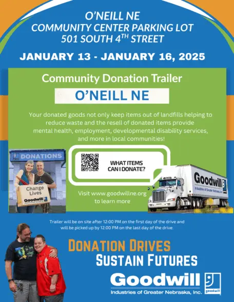 The Goodwill Truck will be in O’Neill from Tuesday, January 13 after noon through Friday, January 16 at Noon. It will be at the O’Neill Community Center Parking Lot at 501 South 4th Street in O’Neill. If the doors are closed please do not leave donations outside.