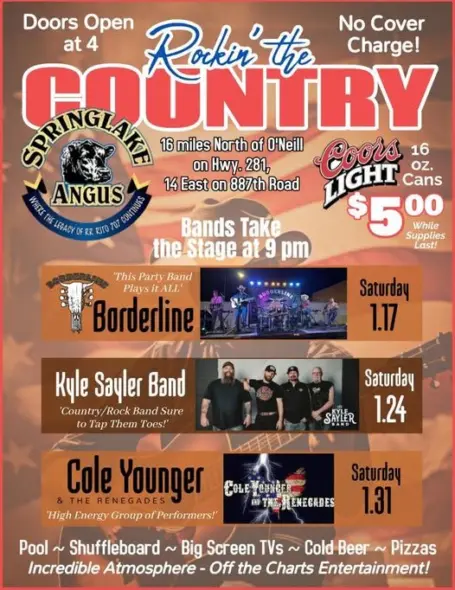Saturday, January 17th – the live band Borderline will be playing at the Springlake Angus Center starting at 9:00pm. Doors open at 4:00pm.